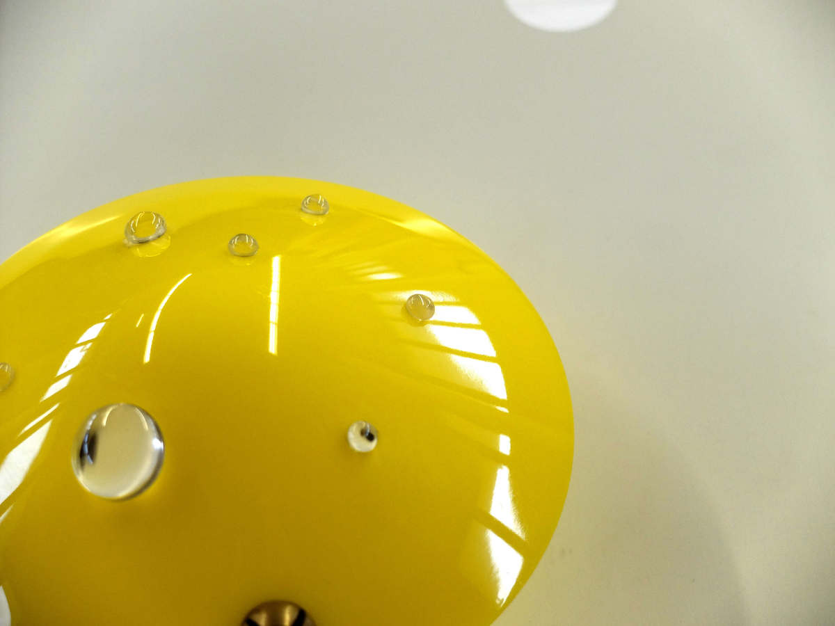 Geometric sheet metal Stilnovo applique with three oval yellow diffuser, attributed to Angelo Lelli, 1950s. The white sheet metal structure carries the wall-hanging apparatus, using which the applique is placed on the wall surface. In its centre we find three circular diffuser features in yellow rigid plastic with elegant pearl-like transparent drops from where the light placed underneath escapes to give an artistic light feature. The circular yellow diffusers are fixed on rotating joints that allow for the possibility to adjust their position as desired. Also pairs with a smaller sister applique with which it can also be sold as a set. measurements of smaller sister applique : 54 x 15 x 35 cm Wiring is in ready-to-use condition. Structural integrity is perfect. Overall condition is fantastic.