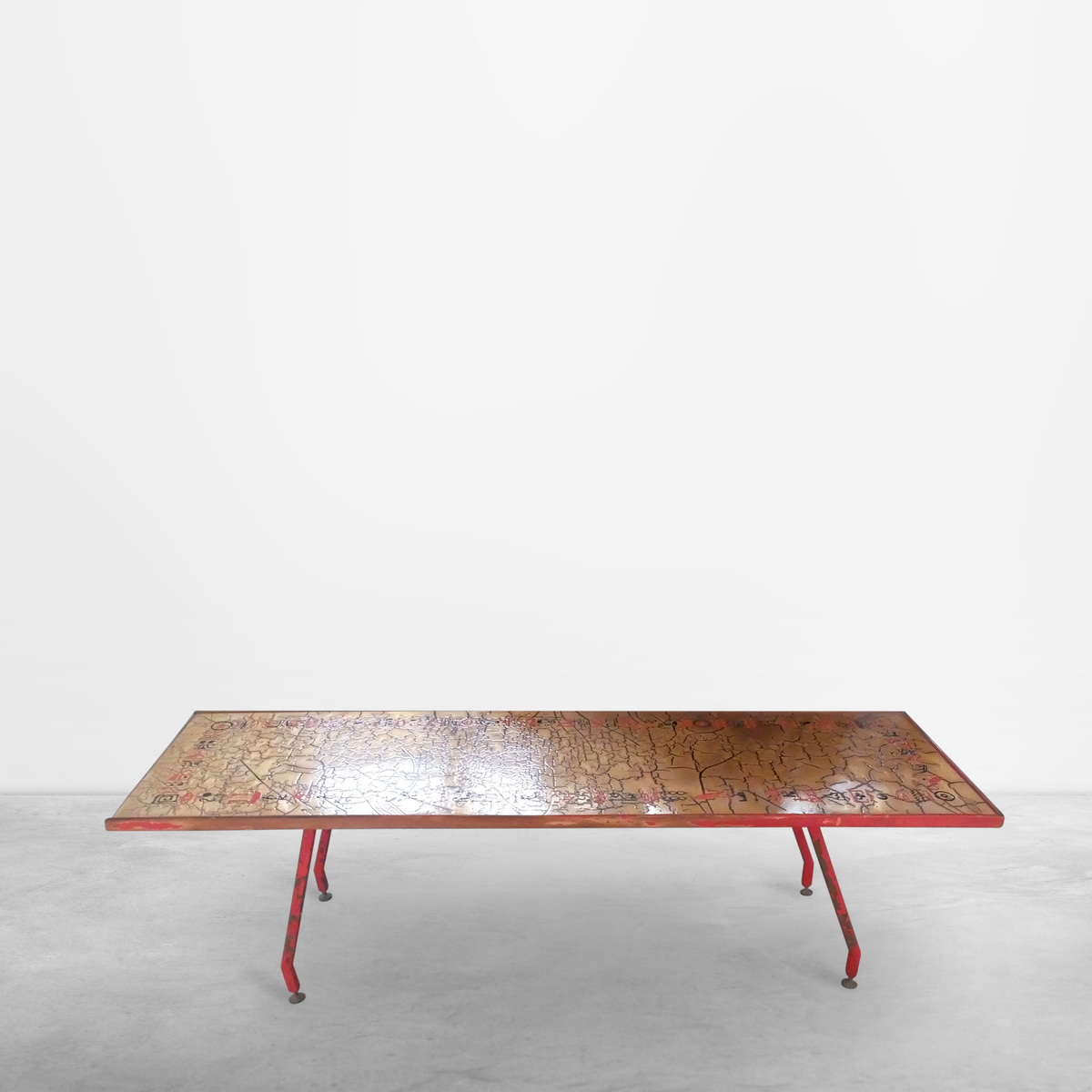 The main surface, held by a geometric red coated metal structure, presents an unique crackle effect on ceramics, with black and red hieroglyphs.